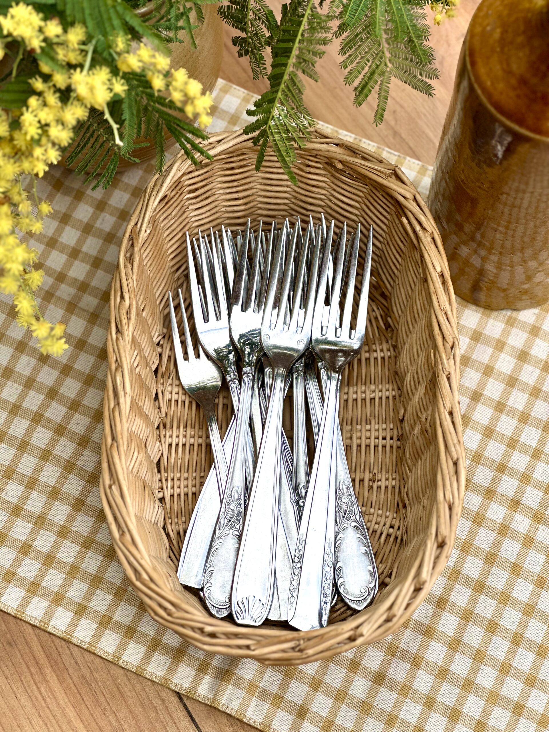 Nos fourchettes vintage dépareillées en métal ou en argent apportent une touche rétro pleine de charme à vos tables. Et parce qu'on tient à leur éclat comme à votre confort, leur nettoyage, tout comme celui de l'ensemble de notre art de la table, est compris et entièrement réalisé par nos soins.