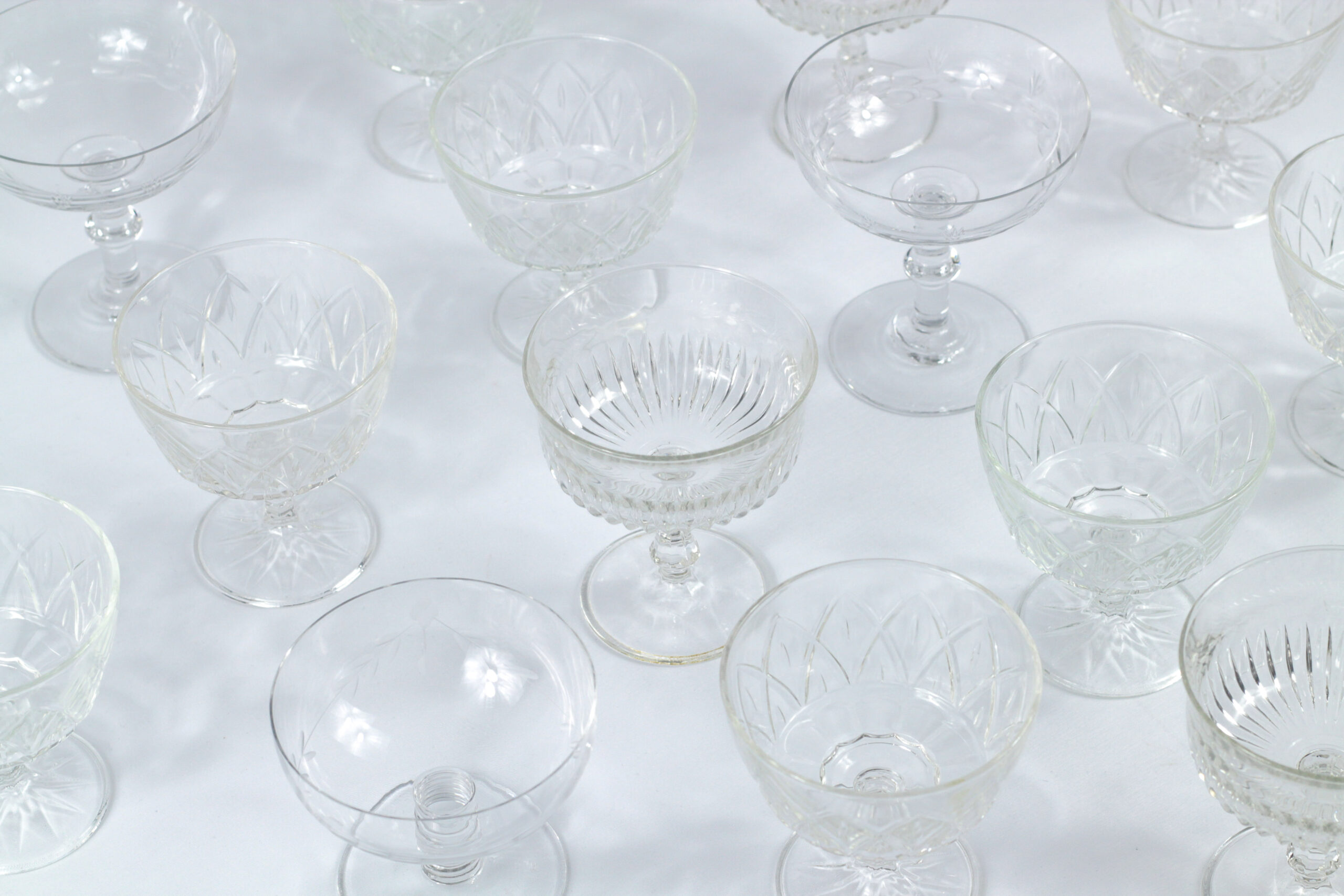 Magnifier l'instant avec nos coupes à champagne ciselées dépareillées. En verre ou en cristal, chaque modèle révèle un motif unique pour une table inoubliable. Et parce qu'on tient à leur éclat comme à votre confort, leur nettoyage, tout comme celui de l'ensemble de notre art de la table, est entièrement réalisé par nos soins.